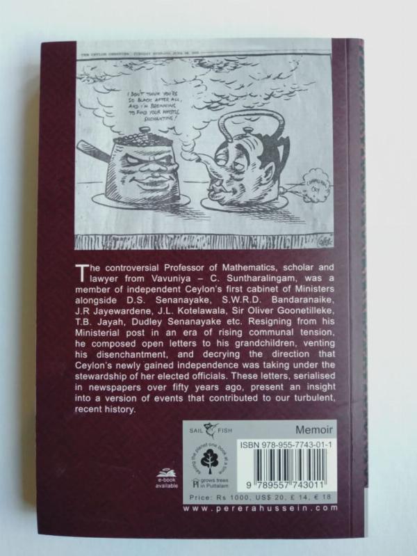 The controversial Professor of Mathematics, scholar and lawyer from Vavuniya – C. Suntharalingam, was a member of independent Ceylons first cabinet of Ministers alongside D.S Senanayake, S.W.R.D Bandaranaike, J.R Jayewardene, J.L Kotelawala, Sir Oliver Goonetilleke, T.B Jayah, Dudley Senanayake etc. Resigning from his Ministerial post in an era of rising communal tension, he composed open letters to his grandchildren, venting his disenchantment, and decrying the direction that Ceylons newly gained independence was taking under the stewardship of her elected officials. These letters, serialised in newspapers over fifty years ago, present an insight into a version of events that contributed to our turbulent, recent history.