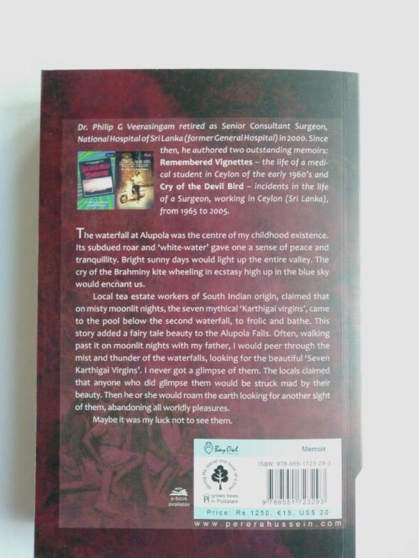 Alupola to Jaffna 1940-1960 The waterfall at Alupola was the centre of my childhood existence. Its subdued roar and white water gave one a sense of peace and tranquility. Bright sunny days would light up the entire valley. The cry of the Brahminy kite wheeling in ecstasy high up in the blue sky would enchant us. Local tea estate workers of South Indian origin, claimed that on misty moonlit nights, the seven mythical Karthigai virgins, came to the pool below the second waterfall, to frolic and bathe. This story added a fairytale beauty to the Alupola Falls. Often, walking past it on moonlit nights with my father, I would peer through the mist and thunder of the waterfalls, looking for the Seven Karthigai Virgins. I never got a glimpse of them. The locals claimed that anyone who did glimpse them would be struck mad by their beauty. Then he or she would roam the earth looking for another sight of them, abandoning all worldly pleasures. Maybe it was my luck not to see them. The third outstanding memoir by Dr Veerasingam which lovingly chronicles days gone by.