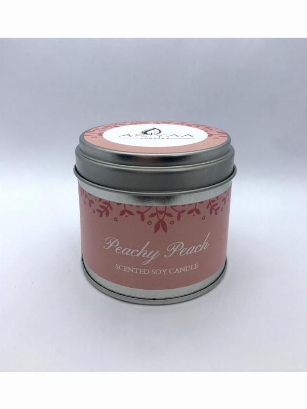 Peachy Peach Soy Wax Tin Candle. Bright fruity bouquet reminiscent of the scent of fresh cut peaches.