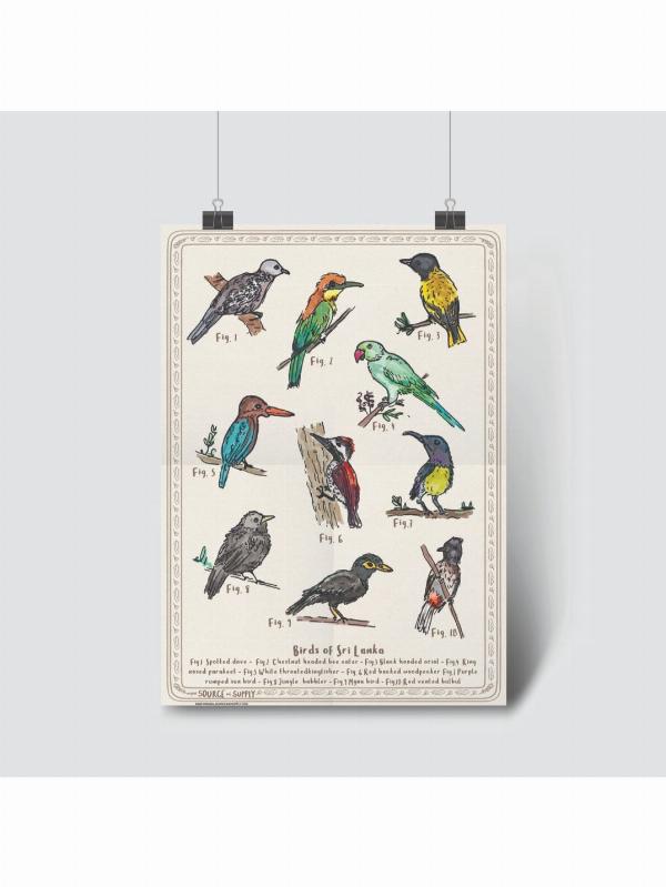 Birds of Sri Lanka poster (A3). Hand Illustrated Sri Lanka Poster 30.5cm x 45.5cm Zero Waste packaging. High quality gloss paper