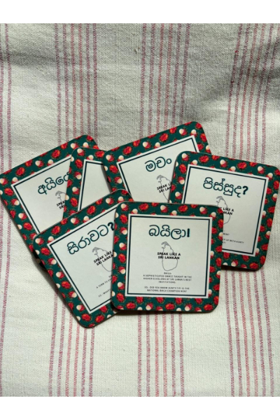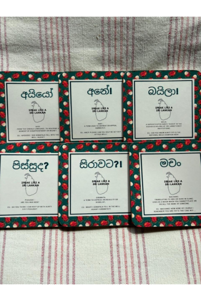 Learn the lingo, one coaster at a time! Our signature Sri Lankanism sets bring the island’s most playful phrases straight to your table.