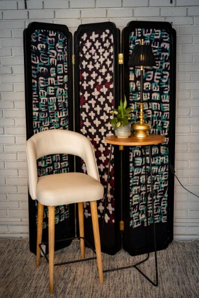 The three-panel screen is crafted from hand dyed Batik fabric panels, with a Mahogany wood frame painted in black.