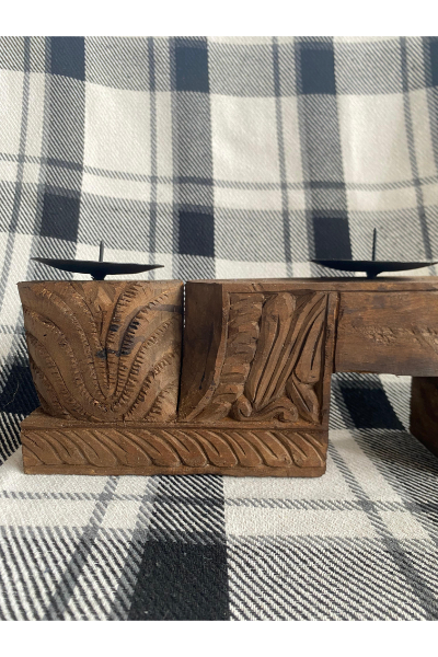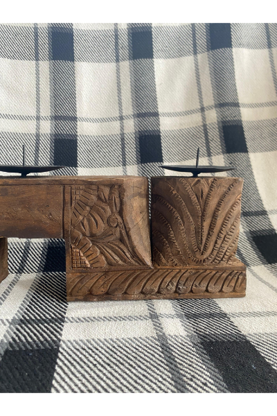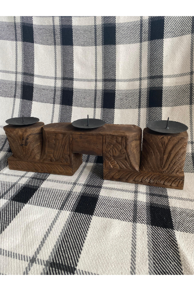 A beautifully carved wooden candle stand featuring three holders in a single elongated design—perfect for adding rustic charm and balanced elegance to any setting.