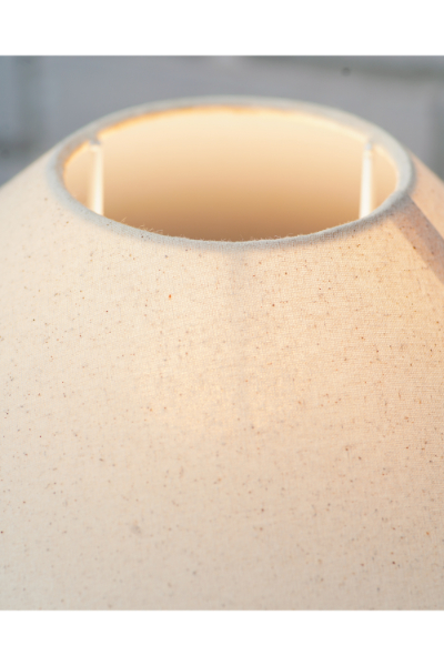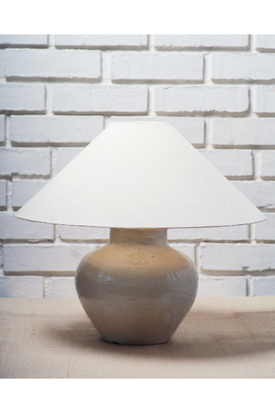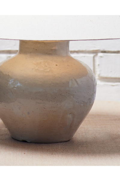 This lamp combines an elegant ivory ceramic base with a warm, amu redi shade, creating a soft, inviting glow.