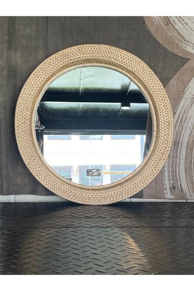 Hand woven round cane frame with a round mirror at its center.